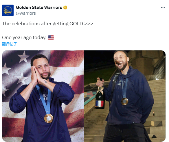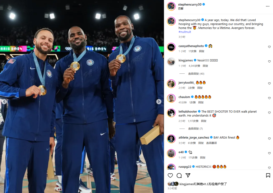 今日库里更新社交媒体,晒出了一年前巴黎奥运会期间的多张照片,配文写道:一年前的今天,我们做到了!和兄弟们一起打球,代表国家,带回了金牌。终生难忘的回忆。复仇者永远在一起。